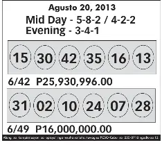 Lotto results here is your daily draw result for pcso s 6 58 6 55 6 49 6 45 6 42 6 digit 4 digit suertres and ez2 play. On wednesday and saturday and millions of dollars to be won each draw. Manila philippines the august 6 2020 6 49 lotto results including all important reminders are available at this page as the philippine charity sweepstakes office pcso releases the official results at its 9pm draw.
